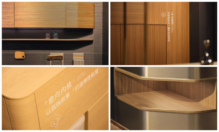 45度斜切結(jié)構(gòu)、骨骼線條、弧形元素、ABA板材工藝……多元美學(xué)融合,呈現(xiàn)全新家居意境。應(yīng)用上,ENF級環(huán)保,4.5米通頂家居,傳奇系列板材、第三代顆粒板、碳晶飾面板……為與會觀眾帶來高顏值、高個性化、高品質(zhì)的整家美學(xué)方案。