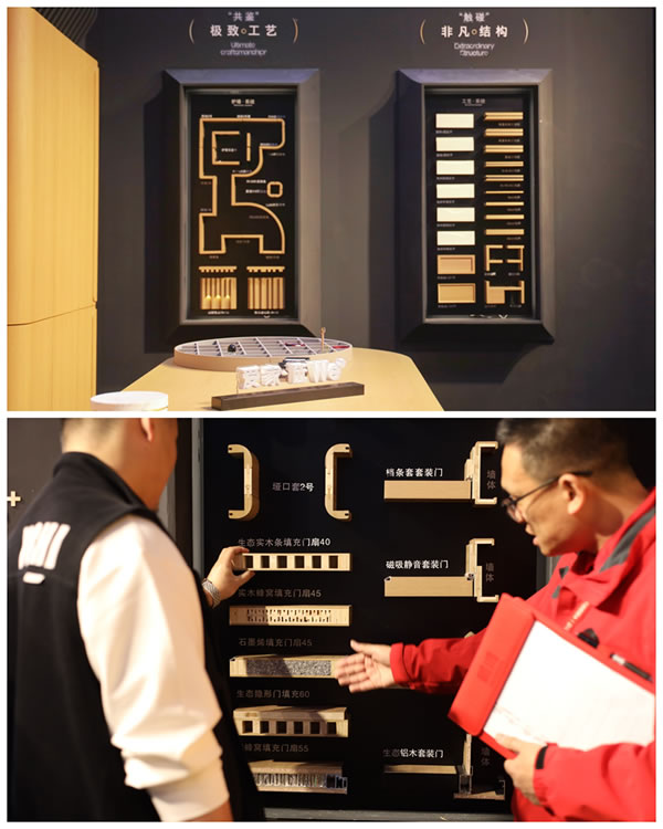 作為此次展會的"現(xiàn)象級"展品,鵬鴻工法墻以模塊化系統(tǒng)思維,通過"解構(gòu)式"陳列,將工藝系統(tǒng)、木門系統(tǒng)與護(hù)墻系統(tǒng)整合,58個工藝模塊覆蓋結(jié)構(gòu)、裝飾與功能三大維度,清晰呈現(xiàn)全屋定制的工藝系統(tǒng)。
